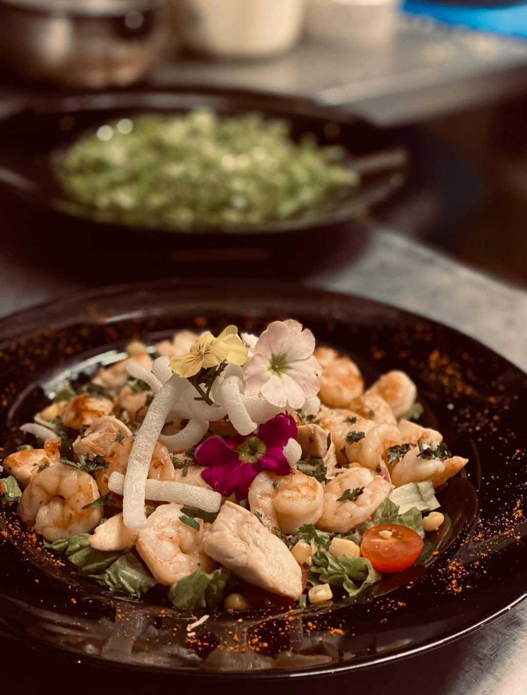 Camarones salteados con bouquet de lechuga, tomate cherry, plumas de cebolla, cubitos de queso y aderezo de la casa