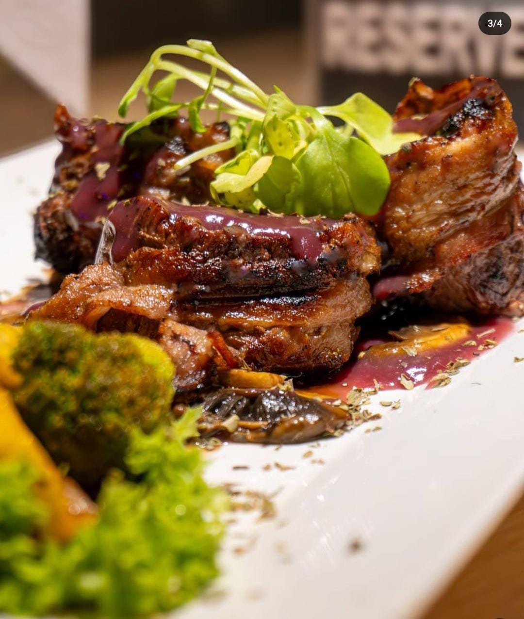 Corte mariposa con un excelente marmoleo llevado al punto deseado, acompañado de ensalada de hortalizas, tomate cherry, aceitunas, mazorquitas baby, zanahoria baby con un delicioso chimichurri ó salsa verde