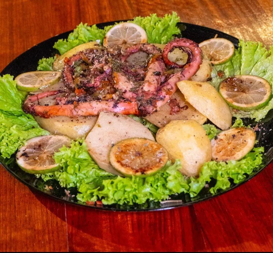 Pulpo marinado en cocción lenta, crocantes laminas de papa, bañadas en salsa de casa aromatizada con limón