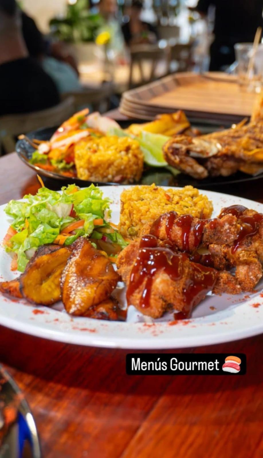 Filete de trucha marinada con limonaria y ajo, acompañada de tostones de plátano caramelizado en miel artesanal y suave ensalada de temporada.